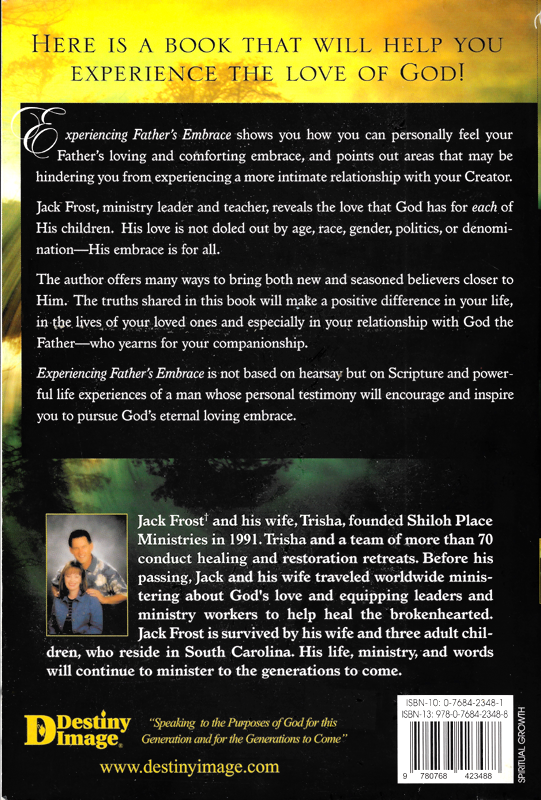 Jack Frost and his wife, Trisha, founded Shiloh Place Ministries in 1991. Trisha and a team of more than 70 conduct healing and restoration retreats. Before his passing, Jack and his wife traveled worldwide ministering about God's love and equipping leaders and ministry workers to help heal the brokenhearted. Jack Frost is survived by his wife and three adult children, who reside in South Carolina. His life, ministry, and words will continue to minister to the generations to come.