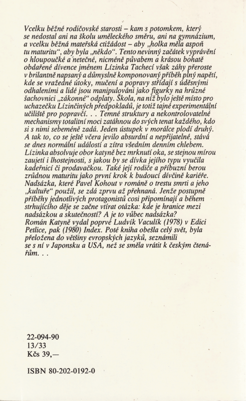 Vcelku běžné rodičovské starosti - kam s potomkem, který se nedostal ani na školu uměleckého směru, ani na gymnázium, a vcelku běžná mateřská ctižádost - aby "holka měla aspoň tu maturitu", aby byla "někdo". Tento nevinný začátek vyprávění o hloupoučké a netečné, nicméně půvabem a krásou bohatě obdařené dívence jménem Lízinka Tachecí však záhy přeroste v brilantně napsaný a důmyslně komponovaný příběh plný napětí, kde se vražedné útoky, mučení a popravy střídají s úděsnými odhaleními a lidé jsou manipulováni jako figurky na hrůzné šachovnici „zákonné“ odplaty. Škola, na níž bylo ještě místo pro uchazečku Lízinčiných předpokladů, je totiž tajné experimentální učiliště pro popravčí... Temné struktury a nekontrolovatelné mechanismy totalitní moci zatáhnou do svých tenat každého, kdo si s nimi sebeméně zadá. Jeden ústupek v morálce plodí druhý. A tak to, co se ještě včera jevilo absurdní a nepřijatelné, stává se dnes normální událostí a zítra všedním denním chlebem. Lízinka absolvuje obor katyně bez mrknutí oka, se stejnou mírou zaujetí i lhostejnosti, s jakou by se dívka jejího typu vyučila kadeřnicí či prodavačkou. Také její rodiče a příbuzní berou zrůdnou maturitu jako první krok k budoucí dívčině kariéře. Nadsázka, které Pavel Kohout v románě o trestu smrti a jeho „kultuře“ použil, se zdá zprvu až přehnaná. Jenže postupně příběhy jednotlivých protagonistů cosi připomínají a během strhujícího děje se začne vtírat otázka: kde je hranice mezi nadsázkou a skutečností? A je to vůbec nadsázka?