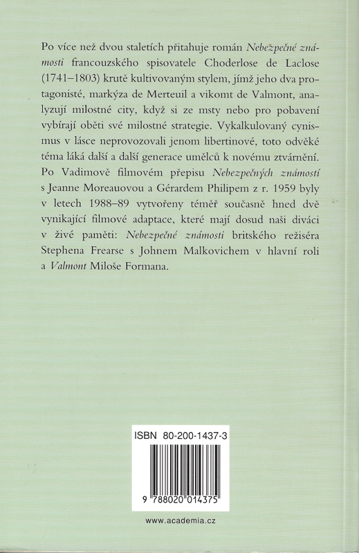 Po více než dvou staletích přitahuje román Nebezpečné známosti francouzského spisovatele Choderlose de Laclose (1741—1803) krutě kultivovaným stylem, jímž jeho dva protagonisté, markýza de Merteuil a vikomt de Valmont, analyzují milostné city, když si ze msty nebo pro pobavení vybírají oběti své milostné strategie. Vykalkulovaný cynismus v lásce neprovozovali jenom libertinové, toto odvěké téma láká další a další generace umělců k novému ztvárnění. Po Vadimově filmovém přepisu Nebezpečných známostí s Jeanne Moreauovou a Gérardem Philipem z r. 1959 byly v letech 1988—89 vytvořeny téměř současně hned dvě vynikající filmové adaptace, které mají dosud naši diváci v živé paměti: Nebezpečné známosti britského režiséra Stephena Frearse s Johnem Malkovichem v hlavní roli a Valmont Miloše Formana.