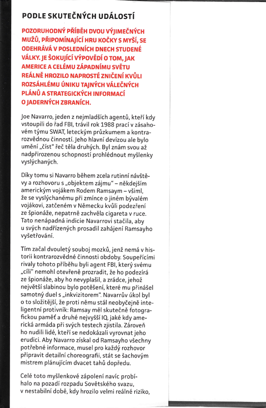 Tím začal dvouletý souboj mozků, jenž nemá v historii kontrarozvědné činnosti obdoby. Soupeřícími rivaly tohoto příběhu byli agent FBI, který svému „cíli" nemohl otevřeně prozradit, že ho podezírá ze špionáže, aby ho nevyplašil, a zrádce, jehož největší slabinou bylo potěšení, které mu přinášel samotný duel s „inkvizitorem". Navarrův úkol byl o to složitější, že proti němu stál neobyčejně inteligentní protivník: Ramsay měl skutečně fotografickou paměť a druhé nejvyšší IQ, jaké kdy americká armáda při svých testech zjistila. Zároveň ho nudili lidé, kteří se nedokázali vyrovnat jeho erudici. Aby Navarro získal od Ramsayho všechny potřebné informace, musel pro každý rozhovor připravit detailní choreografii, stát se šachovým mistrem plánujícím dvacet tahů dopředu.