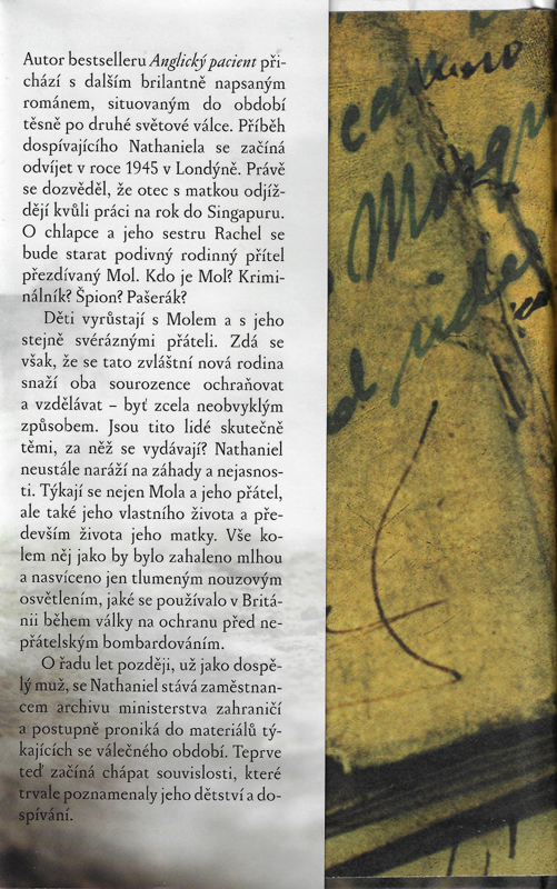 Autor bestselleru Anglický pacient přichází s dalším brilantně napsaným románem, situovaným do období těsně po druhé světové válce. Příběh dospívajícího Nathaniela se začíná odvíjet v roce 1945 v Londýně. Právě se dozvěděl, že otec s matkou odjíždějí kvůli práci na rok do Singapuru. O chlapce a jeho sestru Rachel se bude starat podivný rodinný přítel přezdívaný Mol. Kdo je Mol? Kriminálník? Špion? Pašerák?