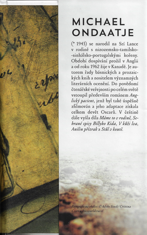 ICHAEL ONDAATJE (* 1943) se narodil na Srí Laňce v rodině s nizozemsko-tamilsko--sinhálsko-portugalskými kořeny. Období dospívání prožil v Anglii a od roku 1962 žije v Kanadě. Je autorem řady básnických a prozaických knih a nositelem významných literárních ocenění. Do povědomí čtenářské veřejnosti po celém světě vstoupil především románem Anglicky pacient, jenž byl také úspěšně zfilmován a jeho adaptace získala celkem devět Oscarů. V češtině dále vyšla díla Máme to v rodině, Sebrané spisy Billyho Kida, V kůzi lva, Anilin přízrak a Stůl v koutě.