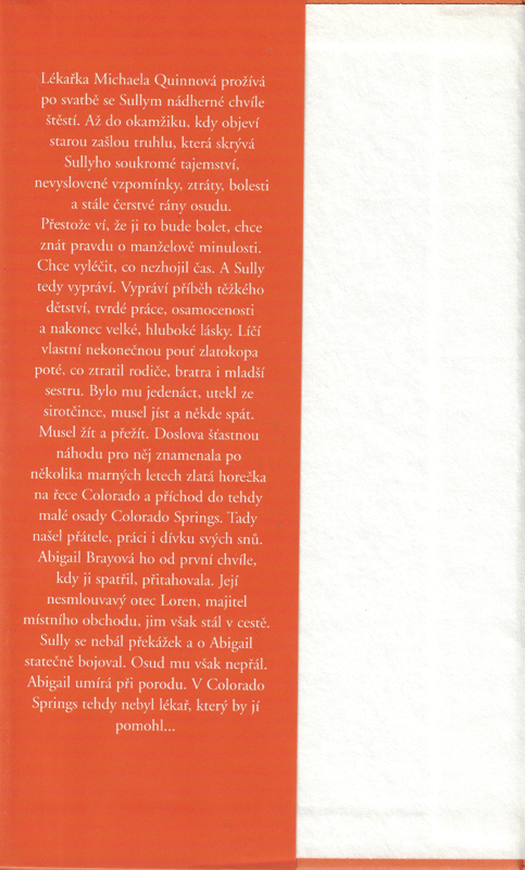 Lékařka Michaela Quinnová prožívá po svatbě se Sullym nádherné chvíle štěstí. Až do okamžiku, kdy objeví starou zašlou truhlu, která skrývá Sullyho soukromé tajemství, nevyslovené vzpomínky, ztráty, bolesti a stále čerstvé rány osudu. Přestože ví, že ji to bude bolet, chce znát pravdu o manželově minulosti. Chce vyléčit, co nezhojil čas. A Sully tedy vypráví. Vypráví příběh těžkého dětství, tvrdé práce, osamocenosti a nakonec velké, hluboké lásky. Líčí vlastní nekonečnou pouť zlatokopa poté, co ztratil rodiče, bratra i mladší sestru. Bylo mu jedenáct, utekl ze sirotčince, musel jíst a někde spát. Musel žít a přežít. Doslova šťastnou náhodu pro něj znamenala po několika marných letech zlatá horečka na řece Colorado a příchod do tehdy malé osady Colorado Springs. Tady našel přátele, práci i dívku svých snů. Abigail Brayová ho od první chvíle, kdy ji spatřil, přitahovala. Její nesmlouvavý otec Loren, majitel místního obchodu, jim však stál v cestě.