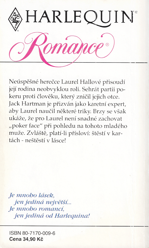 Harlequin - Romance č. 46 B 09/93 | Neúspěšné herečce Laurel Hallové přisoudí její rodina neobvyklou roli. Sehrát partii pokeru proti člověku, který zničil jejich otce. Jack Hartman je přizván jako karetní expert, aby Laurel naučil některé triky. Brzy se však ukáže, že pro Laurel není snadné zachovat „poker face" při pohledu na tohoto mladého muže...