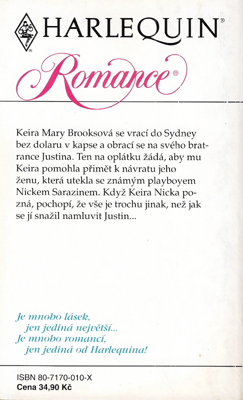 Harlequin - Romance č. 47 C 09/93 | Keira Mary Brooksová se vrací do Sydney bez dolaru v kapse a obrací se na svého bratrance Justina. Ten na oplátku žádá, aby mu Keira pomohla přimět k návratu jeho ženu, která utekla se známým playboyem Nickem Sarazinem. Když Keira Nicka pozná, pochopí, že vše je trochu jinak, než jak se jí snažil namluvit Justin...