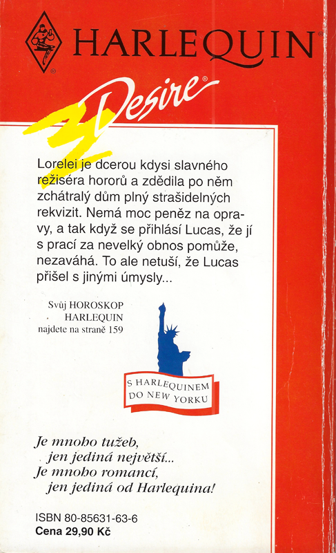 Harlequin - Desire č. 31 M 05/93 | Lorelei je dcerou kdysi slavného režiséra hororů a zdědila po něm zchátralý dům plný strašidelných rekvizit. Nemá moc peněz na opravy, a tak když se přihlásí Lucas, že jí s prací za nevelký obnos pomůže, nezaváhá. To ale netuší, že Lucas přišel s jinými úmysly...