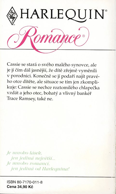 Harlequin Edice: Romance č. 48 D 09/93 | Cassie se stará o svého malého synovce, ale je jí čím dál jasnější, že dítě zřejmě vyměnili v porodnici. Konečně se jí podaří najít pravého otce dítěte, ale situace se tím jen zkomplikuje: Cassie se nechce roztomilého chlapečka vzdát a jeho otec, bohatý a vlivný bankéř Trace Ramsey, také ne.