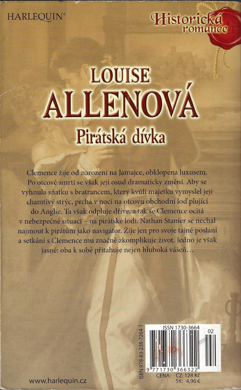 Harlequin - Historická romance č. 311 | Clemence žije od narození na Jamajce, obklopena luxusem. Po otcově smrti se však její osud dramaticky změní. Aby se vyhnula sňatku s bratrancem, který kvůli majetku vymyslel její chamtivý strýc, prchá v noci na otcovu obchodní loď plující do Anglie. Ta však odpluje dříve, a tak se Clemence ocitá v nebezpečné situaci - na pirátské lodi...