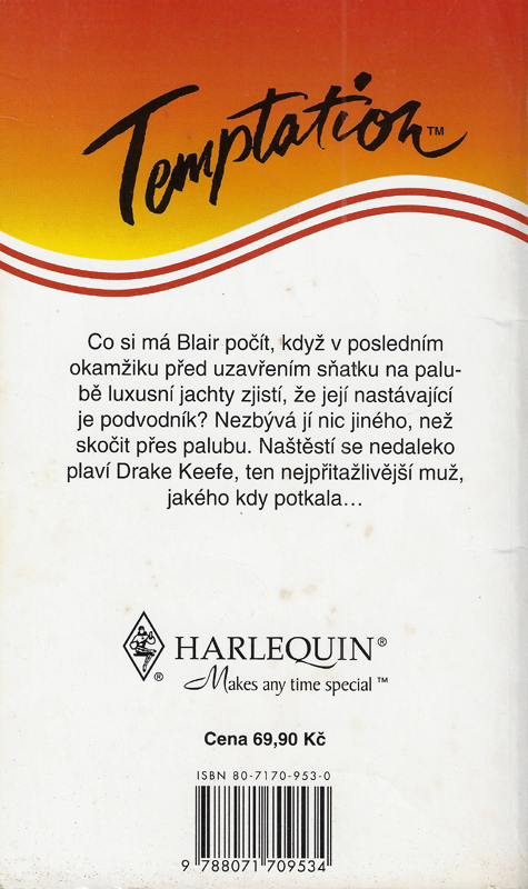 Harlequin Temptation č.182 S 09/98 | Co si má Blair počít, když v posledním okamžiku před uzavřením sňatku na palubě luxusní jachty zjistí, že její nastávající je podvodník? Nezbývá jí nic jiného, než skočit přes palubu. Naštěstí se nedaleko plaví Drake Keefe, ten nejpřitažlivější muž, jakého kdy potkala...