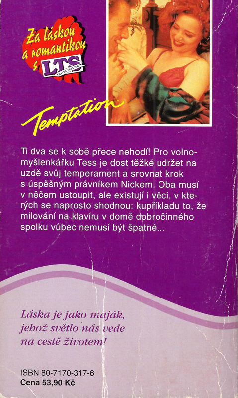 Harlequin - Temptation č. 101 R 06/95 | Ti dva se k sobě přece nehodí! Pro volnomyšlenkářku Tess je dost těžké udržet na uzdě svůj temperament a srovnat krok s úspěšným právníkem Nickem. Oba musí v něčem ustoupit, ale existují i věci, v kterých se naprosto shodnou: kupříkladu to, že milování na klavíru v domě dobročinného spolku vůbec nemusí být špatné...