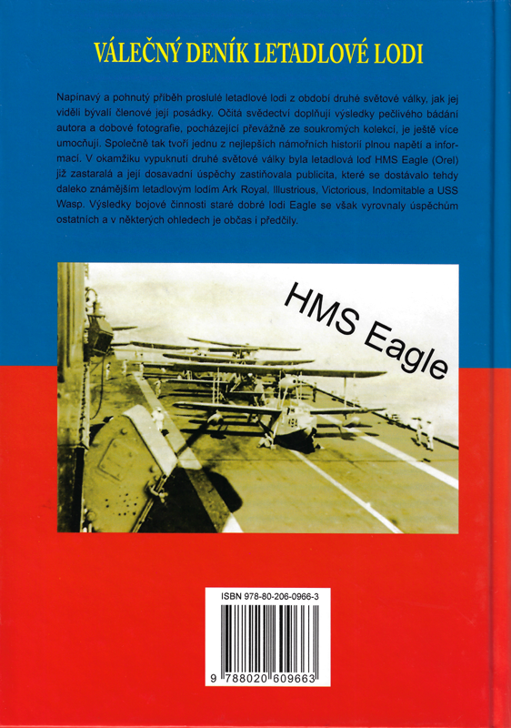 Napínavý a pohnutý příběh proslulé letadlové lodi z období druhé světové války, jak jej viděli bývalí členové její posádky. Očitá svědectví doplňují výsledky pečlivého bádání autora a dobové fotografie, pocházející převážně ze soukromých kolekcí, je ještě více umocňují. Společně tak tvoří jednu z nejlepších námořních historií plnou napětí a informací. V okamžiku vypuknutí druhé světové války byla letadlová loď HMS Eagle (Orel) již zastaralá a její dosavadní úspěchy zastiňovala publicita, které se dostávalo tehdy daleko známějším letadlovým lodím Ark Royal, lllustrious, Victorious, Indomitable a USS Wasp. Výsledky bojové činnosti staré dobré lodi Eagle se však vyrovnaly úspěchům ostatních a v některých ohledech je občas i předčily.