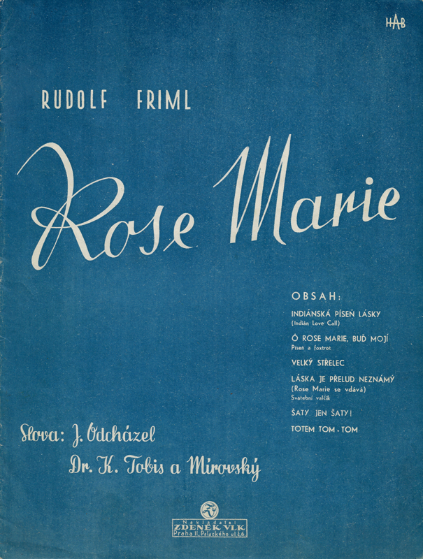 Slova: J. Odcházel, Dr. K. Tobis a Mírovský. Noty. Obsah: Indiánská píseň lásky (Indián Love Call), Ó Rose Marie, buď mojí (Píseň a foxtrot), Velký střelec, Láska je přelud neznámý (Rose Marie se vdává) (Svatební valčík), Šaty, jen šaty!, Totem Tom-Tom.