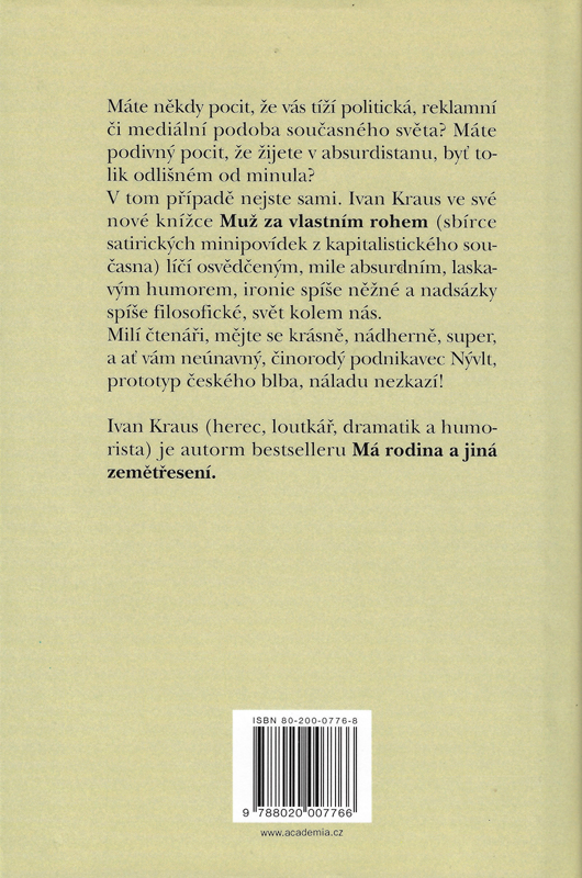 Máte pocit, že vás tíží politická, reklamní či mediální podoba současného světa? Máte podivný pocit, že žijete v absurdistanu, byť tolik odlišném od minula? Nejste sami. Ivan Kraus ve své knížce Muž za vlastním rohem (sbírce satirických minipovídek z kapitalistického současna) líčí osvědčeným, mile absurdním, laskavým humorem, ironie spíše něžné a nadsázky spíše filosofické, svět kolem nás.