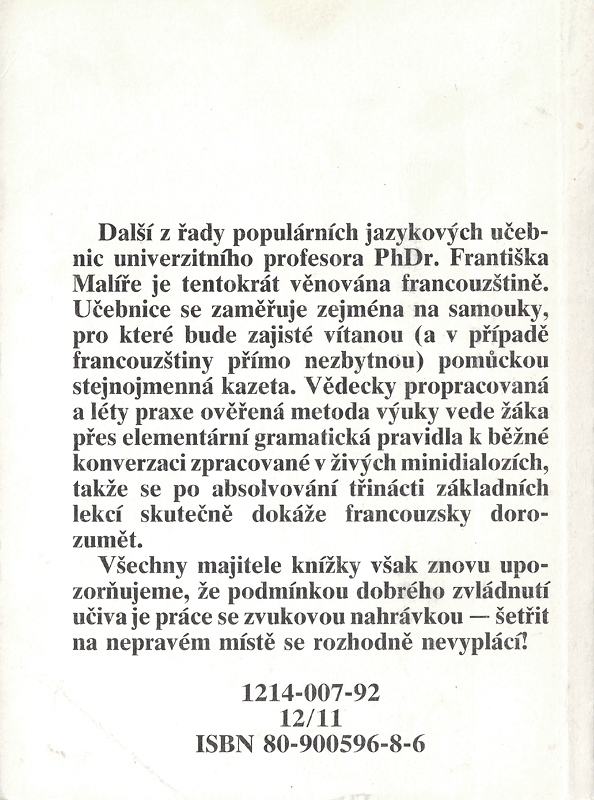 Další z řady populárních jazykových učebnic univerzitního profesora PhDr. Františka Malíře je tentokrát věnována francouzštině. Učebnice se zaměřuje zejména na samouky, pro které bude zajisté vítanou (a v případě francouzštiny přímo nezbytnou) pomůckou stejnojmenná kazeta. Vědecky propracovaná a léty praxe ověřená metoda výuky vede žáka přes elementární gramatická pravidla k běžné konverzaci zpracované v živých minidialozích, takže se po absolvování třinácti základních lekcí skutečně dokáže francouzský dorozumět.