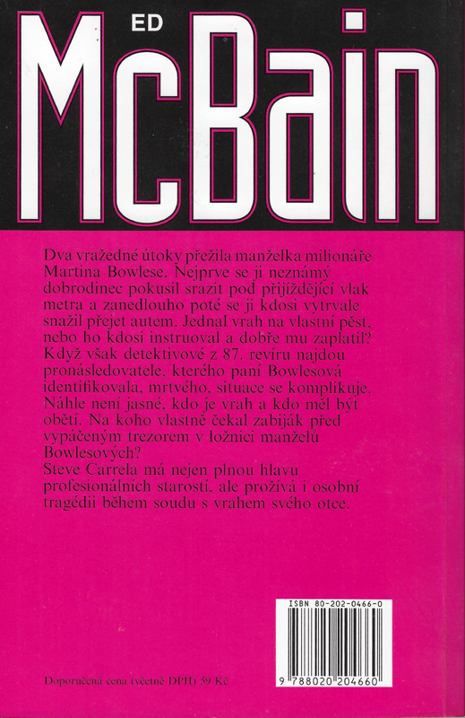 Dva vražedné útoky přežila manželka milionáře Martina Bowlese. Nejprve se ji neznámý dobrodinec pokusil srazit pod přijíždějící vlak metra a zanedlouho se ji kdosi vytrvale snažil přejet autem. Jednal vrah na vlastní pěst, nebo ho kdosi instruoval a dobře mu zaplatil? Když však detektivové z 87. revíru najdou pronásledovatele, kterého paní Bowlesová identifikovala, mrtvého, situace se komplikuje.