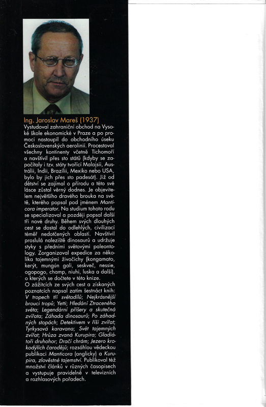 Ing. Jaroslav Mareš (1937) vystudoval zahraniční obchod na Vysoké škole ekonomické v Praze a po promoci nastoupil do obchodního úseku Československých aerolinií. Procestoval všechny kontinenty včetně Tichomoří a navštívil přes sto států (kdyby se započítaly i tzv. státy tvořící Malajsii, Austrálii, Indii, Brazílii, Mexiko nebo USA, bylo by jich přes sto padesát). Již od dětství se zajímal o přírodu a této své lásce zůstal věrný dodnes. Je objevitelem největšího dravého brouka na světě, kterého popsal pod jménem Manticoro imperator. Na studium tohoto rodu se specializoval a později popsal další tři nové druhy. Během svých dlouhých cest se dostal do odlehlých, civilizací téměř nedotčených oblastí. Navštívil proslulá naleziště dinosaurů a udržuje styky s předními světovými paleontology. Zorganizoval expedice za několika tajemnými živočichy (kongamato, kerýt, mungún gali, seskveč, nessie, ogopogo, champ, niuhi, luska a další), o kterých se dočtete v této knize.