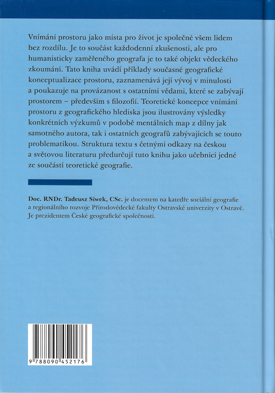 Vnímání prostoru jako místa pro život je společné všem lidem bez rozdílu. Je to součást každodenní zkušenosti, ale pro humanisticky zaměřeného geografa je to také objekt vědeckého zkoumání. Tato kniha uvádí příklady současné geografické konceptualizace prostoru, zaznamenává její vývoj v minulosti a poukazuje na provázanost s ostatními vědami, které se zabývají prostorem - především s filozofií. Teoretické koncepce vnímání prostoru z geografického hlediska jsou ilustrovány výsledky konkrétních výzkumů v podobě mentálních map z dílny jak samotného autora, tak i ostatních geografů zabývajících se touto problematikou. Struktura textu s četnými odkazy na českou a světovou literaturu předurčují tuto knihu jako učebnici jedné ze součástí teoretické geografie.