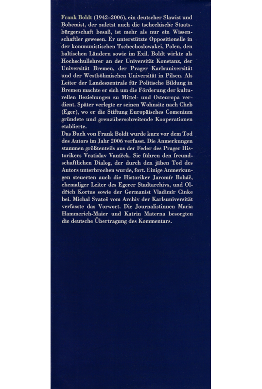Das Buch von Frank Boldt wurde kurz vor dem Tod des Autors im Jahr 2006 verfasst. Die Anmerkungen stammen größtenteils aus der Feder des Prager Historikers Vratislav Vaníček. Sie führen den freundschaftlichen Dialog, der durch den jähen Tod des Autors unterbrochen wurde, fort. Einige Anmerkungen steuerten auch die Historiker Jaromír Boháč, ehemaliger Leiter des Egerer Stadtarchivs, und 01-dřich Kortus sowie der Germanist Vladimír Cinke bei. Michal Svatoš vom Archiv der Karlsuniversität verfasste das Vorwort. Die Journalistinnen Maria Hammerich-Maier und Katrin Materna besorgten die deutsche Übertragung des Kommentars.