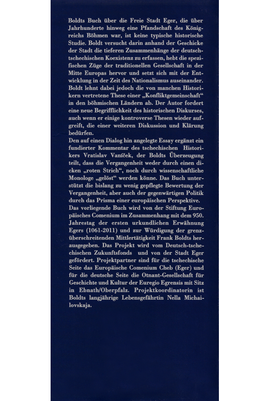 Den auf einen Dialog hin angelegte Essay ergänzt ein fundierter Kommentar des tschechischen Historikers Vratislav Vaníček, der Boldts Überzeugung teilt, dass die Vergangenheit weder durch einen dicken „roten Strich", noch durch wissenschaftliche Monologe „gelöst" werden könne. Das Buch unterstützt die bislang zu wenig gepflegte Bewertung der Vergangenheit, aber auch der gegenwärtigen Politik durch das Prisma einer europäischen Perspektive. Das vorhegende Buch wird von der Stiftung Europäisches Comenium im Zusammenhang mit dem 950. Jahrestag der ersten urkundlichen Erwähnung Egers (1061-2011) und zur Würdigung der grenzüberschreitenden Mittlertätigkeit Frank Boldts herausgegeben. Das Projekt wird vom Deutsch-tschechischen Zukunftsfonds und von der Stadt Eger gefördert. Projektpartner sind für die tschechische Seite das Europäische Comenium Cheb (Eger) und für die deutsche Seite die Otnant-Gesellschaft für Geschichte und Kultur der Euregio Egrensis mit Sitz in Ebnath/Oberpfalz. Projektkoordinatorin ist Boldts langjährige Lebensgefährtin Nella Michailovskaja.