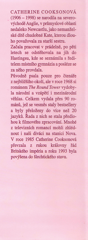 COOKSONOVÁ, Catherine CATHERINE COOKSONOVÁ (1906 - 1998) se narodila na severovýchodě Anglie, v průmyslové oblasti nedaleko Newcastlu, jako nemanželské dítě chudobné Kate, kterou dlouho považovala za starší sestru. Začala pracovat v prádelně, po pěti letech se odstěhovala na jih do Hastingsu, kde se seznámila s ředitelem místního gymnázia a posléze se za něho provdala. Původně psala pouze pro čtenáře z nejbližšího okolí, ale v roce 1968 si románem The Round Tower vydobyla národní a vzápětí i mezinárodní věhlas. Celkem vydala přes 90 románů, jež se vesměs staly bestsellery a byly přeloženy do více než 20 jazyků. Řada z nich se stala předlohou k filmovému zpracování. Mnohé z televizních romancí mohli zhlédnout i naši diváci na stanici Nova. V roce 1985 Catherine Cooksonová převzala z rukou královny řád Britského impéria a roku 1993 byla povýšena do šlechtického stavu.