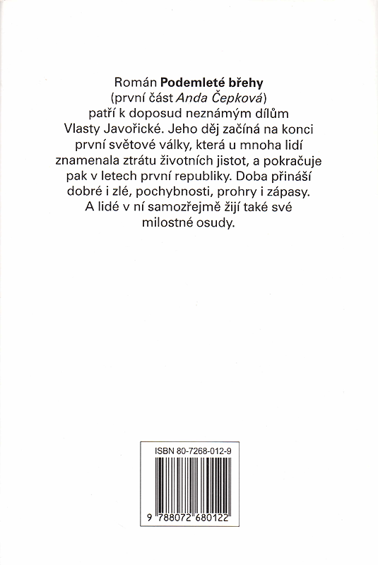 Román Podemleté břehy (první část Anda Čepková) patří k doposud neznámým dílům Vlasty Javořické. Jeho děj začíná na konci první světové války, která u mnoha lidí znamenala ztrátu životních jistot, a pokračuje pak v letech první republiky. Doba přináší dobré i zlé, pochybnosti, prohry i zápasy. A lidé v ní samozřejmě žijí také své milostné osudy.