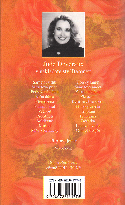 Jude Deveraux je již více než deset let známa českým čtenářům jako autorka úspěšných románů pro ženy. Díky nakladatelství Baronet dosáhl počet jejích příběhů přeložených do češtiny již čtyř desítek. Jude Deveraux se narodila ve městě Santa Fe ve státě Nové Mexiko na jihu Spojených států a spisovatelské dráze se věnuje již po čtvrt století od roku 1976. Po nějakou dobu žila v Anglii, na starobylém, téměř strašidelném zámeckém sídle starém několik století, z něhož přímo dýchá atmosféra jejích historických příběhů, nyní se vrátila do Spojených států. Romantické příběhy Jude Deveraux vycházejí po celém světě a jejich celkový náklad se už blíží čtyřiceti milionům výtisků. Srdce českých čtenářů si okamžitě dobyla čtyřdílnou historickou ságou Sametový slib, Horský samet, Sametová píseň a Sametový anděl, která už vyšla ve třech českých vydáních. Vypráví v ní příběh šlechtického rodu Montgomeryů, který se odehrává v šestnáctém století za vlády Jindřicha VII., zakladatele slavné dynastie Tudorovců. (Zdroj textu a foto: přebal knihy "První dojem", 2006, Baronet, Praha.)