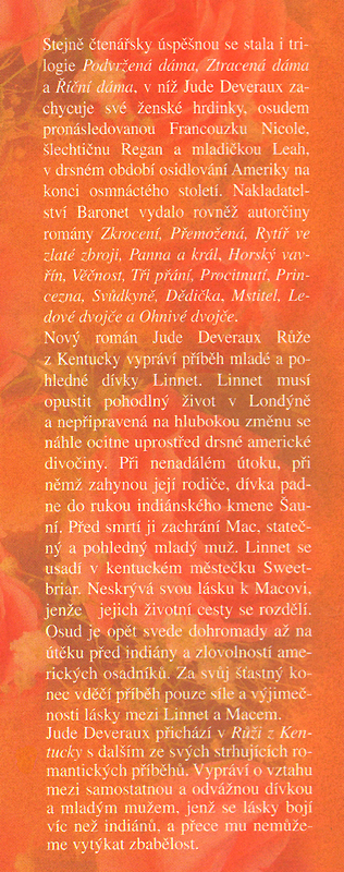 Jude Deveraux přichází v Růži z Kentucky s dalším ze svých strhujících romantických příběhů. Vypráví o vztahu mezi samostatnou a odvážnou dívkou a mladým mužem, jenž se lásky bojí víc než indiánů, a přece mu nemůžeme vytýkat zbabělost.
