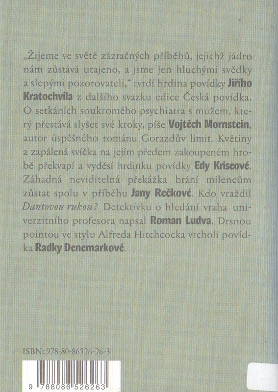 „Žijeme ve světě zázračných příběhů, jejichž jádro nám zůstává utajeno, a jsme jen hluchými svědky a slepými pozorovateli," tvrdí hrdina povídky Jiřího Kratochvila z dalšího svazku edice Česká povídka. O setkáních soukromého psychiatra s mužem, který přestává slyšet své kroky, píše Vojtěch Mornstein, autor úspěšného románu Gorazdův limit. Květiny a zapálená svíčka na jejím předem zakoupeném hrobě překvapí a vyděsí hrdinku povídky Edy Kriseové. Záhadná neviditelná překážka brání milencům zůstat spolu v příběhu Jany Rečkové. Kdo vraždil Dantovou rukou? Detektivku o hledání vraha univerzitního profesora napsal Roman Ludva. Drsnou pointou ve stylu Alfreda Hitchcocka vrcholí povídka Radky Denemarkové.