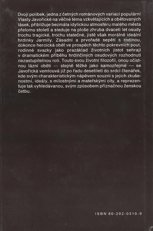 Dvojí polibek, jedna z četných románových variací populární V. Javořické na věčné téma vzkvétajících a obětovaných lásek, přibližuje bezmála idylickou atmosféru malého města přelomu století a sleduje na ploše zhruba dvaceti let osudy trochu tragické, trochu statečné, jistě však morálně ideální hrdinky Jarmily. Zásadní a prvořadé sepětí s rodinou, dokonce heroická oběť ve prospěch těchto pokrevních pout, rodinné svazky jako prazáklad životních jistot sehrají v dramatickém příběhu hrdinčiných osudových rozhodnutí nezastupitelnou roli. Touto svou životní filozofií, onou očistnou lázní oběti - sejně těžké jako samozřejmé - se Javořická vemlouvá již po řadu desetiletí do srdcí čtenářek, kde svým charakteristickým nápěvem souzní s jejich zkušenostmi, ideály, s milostnými a mateřskými city, a reprezentuje tak vyhledávanou, svým způsobem příznačnou ženskou četbu.