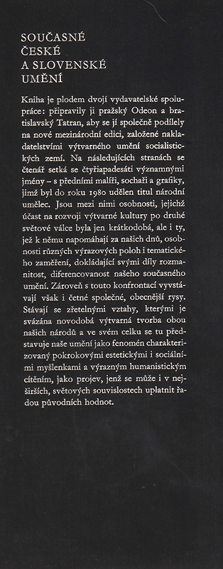 Kniha je plodem dvojí vydavatelské spolupráce: připravily ji pražský Odeon a bratislavský Tatran, aby se jí společně podílely na nové mezinárodní edici, založené nakladatelstvími výtvarného umění socialistických zemí. Na následujících stranách se čtenář setká se čtyřiapadesáti významnými jmény - s předními malíři, sochaři a grafiky, jimž byl do roku 1980 udělen titul národní umělec. Jsou mezi nimi osobnosti, jejichž účast na rozvoji výtvarné kultury po druhé světové válce byla jen krátkodobá, ale i ty, jež k němu napomáhají za našich dnů, osobnosti různých výrazových poloh i tematického zaměření, dokládající svými díly rozmanitost, diferencovanost našeho současného umění. Zároveň s touto konfrontací vyvstávají však i četné společné, obecnější rysy. Stávají se zřetelnými vztahy, kterými je svázána novodobá výtvarná tvorba obou našich národů a ve svém celku se tu představuje naše umění jako fenomén charakterizovaný pokrokovými estetickými i sociálními myšlenkami a výrazným humanistickým cítěním, jako projev, jenž se může i v nejširších, světových souvislostech uplatnit řadou původních hodnot.