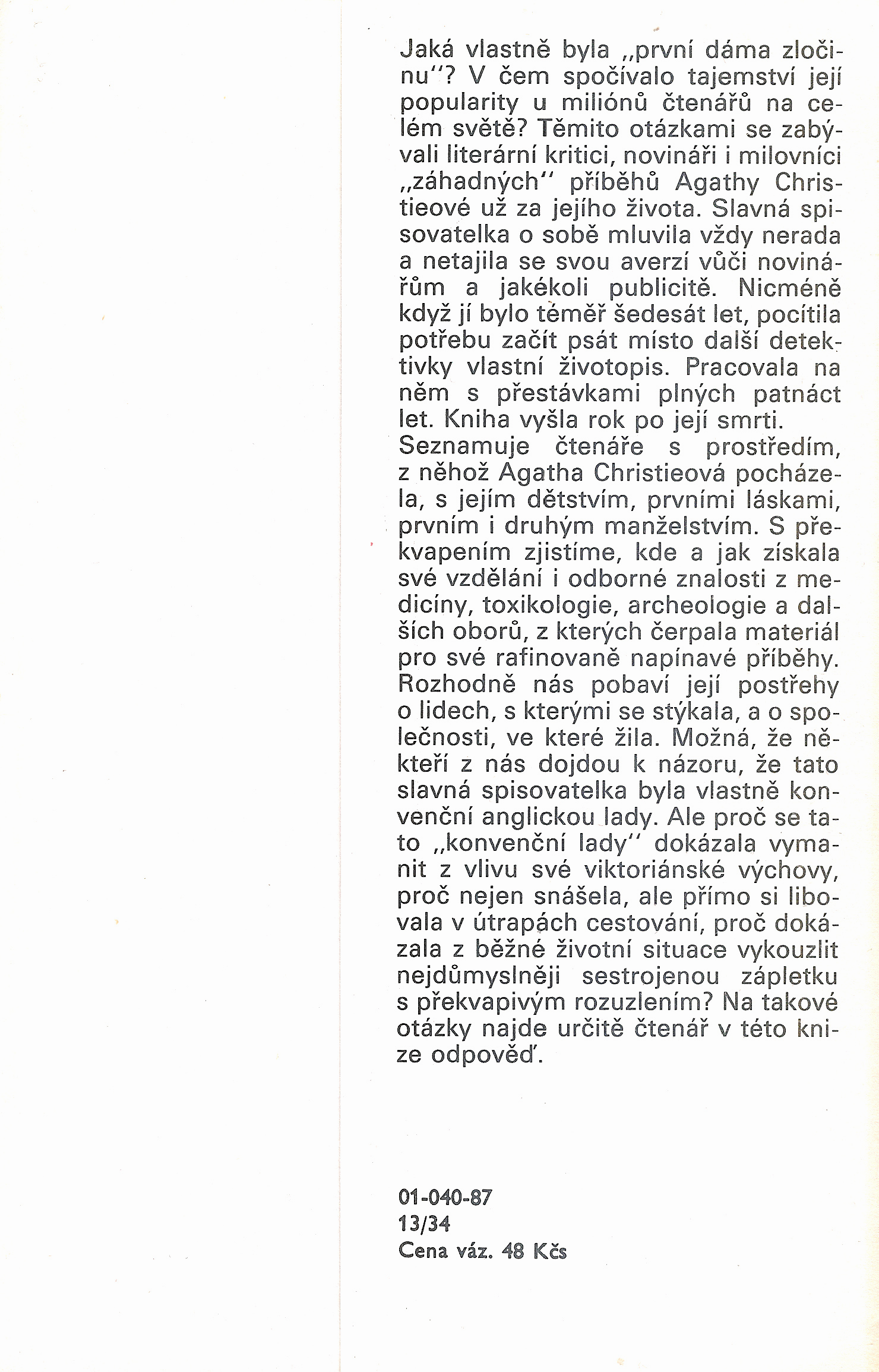 Nejproslulejší detektivní autorka všech dob Agatha Christieová (1890 až 1976) získala za svou tvorbu nejen vysoká oficiální uznání (anglická královna jí propůjčila doživotní šlechtický titul, byla vyznamenána Komandérským řádem britské říše a byl jí udělen čestný doktorát písemnictví), ale především neutuchající věrnou lásku stamiliónů čtenářů po celém světě, jak o tom svědčí neuvěřitelně vysoké číselné údaje, týkající se stále opakovaných vydání jejích více než sedmdesáti románů a dvaceti povídkových sbírek. Značný počet jich měli možnost poznat i čeští čtenáři. Připomeňme si aspoň několik nejznámějších: Deset malých černoušků (Ten Little Indians), Vražda v Orient-expresu (Murder on the Orient Express), Záhadná událost ve styleském sídle (The Mysterious Affair at Styles), Vraždy podle abecedy (The ABC Murders), Smrt staré posluhovačky (Mrs. McGinty’s Dead), Vždyť je to hračka (Murder Is Easy), Nemesis, Kapsa plná žita (A Pocket Full of Rye), Opona (The Curtain) či výbor z povídek Muž v mlze.