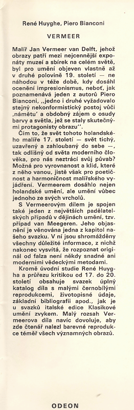 Kromě úvodní studie René Huygha a průřezu kritikou od 17. do 20. století obsahuje svazek úplný katalog díla s malými černobílými reprodukcemi, životopisné údaje, základní bibliografii apod., jak je u svazků italské edice Klasikové umění zvykem. Malý rozsah Vermeerova díla navíc dovoluje, aby zde čtenář nalezl barevné reprodukce téměř všech významných obrazů.