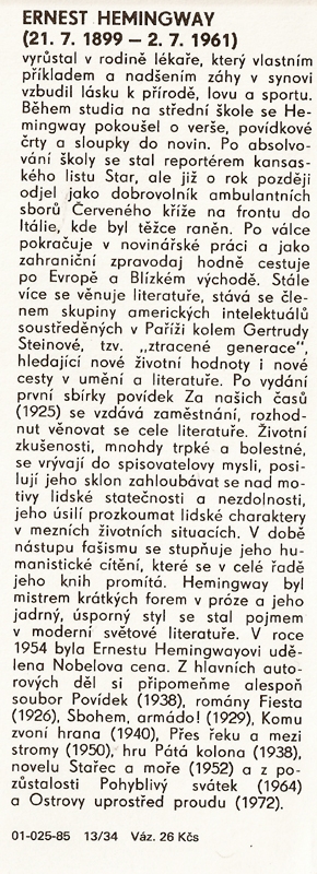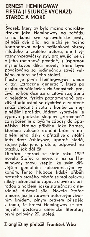 | V originále | The Sun Also Rises a The Old Man an the Sea |