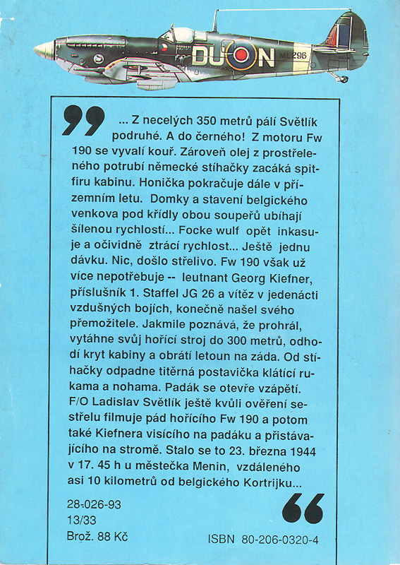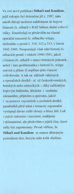 Ve své nové publikaci Stíhači nad Kanálem, jejíž rukopis byl dokončen již r. 1987, nám autoři dávají možnost nahlédnout do bojové činnosti čs. stíhačů v RAF během druhé světové války. Soustřeďují se především na vlastní operační nasazení čs. stíhacího wingu, složeného z perutí č. 310, 312 a 313, v letech 1942-1945. Neopomíjejí však také historii čs. stíhacích perutí v období 1940-1941, jakož i činnost čs. stíhačů v rámci britských jednotek, neboť i tato problematika s historií čs. wingu souvisí a přímo či nepřímo jeho činnost ovlivňovala. A tak na základě válečných a operačních deníků - ať už československých, britských nebo německých -, díky zažloutlým bojovým hlášením, úředním i osobním záznamům, přípisům a zprávám, jakož i za pomoci vzpomínek a osobních deníků pamětníků před námi z temnoty zapomnění vystupují dávno zašlé obrazy a hlasy lidí. Lidí s jejich radostmi i starostmi, nadějemi i zklamáními, ale především s jejich činy, které měly být zapomenuty. Pevně věříme, že Stíhači nad Kanálem se stanou důstojným pomníkem těm, kterým stále tolik dlužíme.