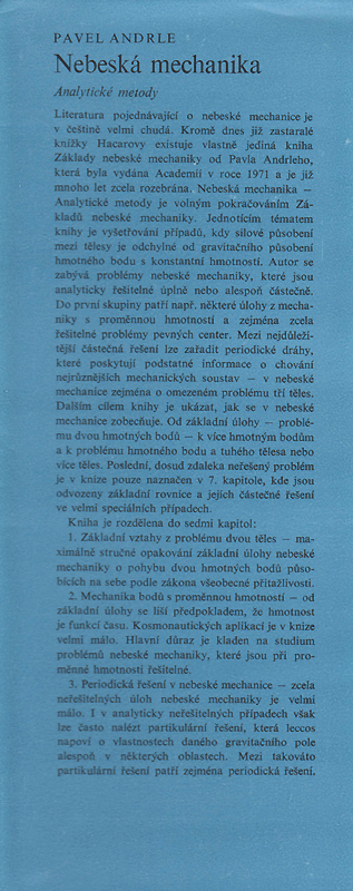 Literatura pojednávající o nebeské mechanice je v češtině velmi chudá. Kromě dnes již zastaralé knížky Hacarovy existuje vlastně jediná kniha Základy nebeské mechaniky od Pavla Andrleho, která byla vydána Academií v roce 1971 a je již mnoho let zcela rozebrána. Nebeská mechanika — Analytické metody je volným pokračováním Základů nebeské mechaniky. Jednotícím tématem knihy je vyšetřování případů, kdy silové působení mezi tělesy je odchylné od gravitačního působení hmotného bodu s konstantní hmotností. Autor se zabývá problémy nebeské mechaniky, které jsou analyticky řešitelné úplně nebo alespoň částečně. Do první skupiny patří např. některé úlohy z mechaniky s proměnnou hmotností a zejména zcela řešitelné problémy pevných center. Mezi nejdůležitější částečná řešení lze zařadit periodické dráhy, které poskytují podstatné informace o chování nejrůznějších mechanických soustav — v nebeské mechanice zejména o omezeném problému tří těles. Dalším cílem knihy je ukázat, jak se v nebeské mechanice zobecňuje. Od základní úlohy — problému dvou hmotných bodů — k více hmotným bodům a k problému hmotného bodu a tuhého tělesa nebo více těles. Poslední, dosud zdaleka neřešený problém je v knize pouze naznačen v 7. kapitole, kde jsou odvozeny základní rovnice a jejich částečné řešení ve velmi speciálních případech.