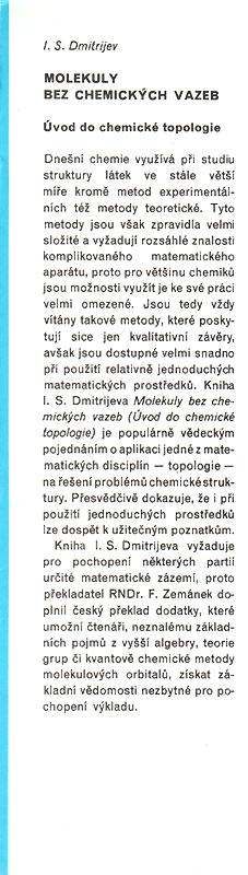 Úvod do chemické topologie. Kniha I. S. Dmitrijeva Molekuly bez chemických vazeb (Úvod do chemické topologie) je populárně vědeckým pojednáním o aplikaci jedné z matematických disciplín — topologie — na řešení problémů chemické struktury. Přesvědčivě dokazuje, že i při použití jednoduchých prostředků lze dospět k užitečným poznatkům.