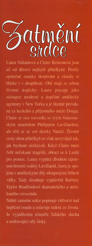 Laura Valiantová a Claire Bensonová jsou už od dětství nejlepší přítelkyně. Prošly společně zmatky dospívání a zůstaly si blízké i v dospělosti. Obě mají za sebou životní úspěchy: Laura pracuje jako zástupce moderní a úspěšné umělecké agentury v New Yorku a je šťastně provdaná za hezkého a příjemného muže Douga. Claire se sice rozvedla se svým francouzským manželem Philippem Lavillardem, ale těší se ze své dcerky Nataši. Životní cesty obou přítelkyň se však nevyvíjejí tak, jak bychom očekávali. Když Claire musí čelit nečekané tragédii, obrací se k Lauře pro pomoc. Laura vypátrá dlouhou tajemnou historii rodiny Lavillardů, která je spojena s uměleckými díly uloupenými během války. Tady dosahuje vyprávění Barbary Taylor Bradfordové dramatického a nečekaného crescenda.