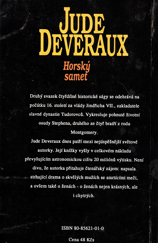 Jude Deveraux dnes patří mezi nejúspěšnější světové autorky. Její knížky vyšly v celkovém nákladu převyšujícím astronomickou cifru 20 miliónů výtisku. Není divu, že autorka přitahuje čtenářský zájem: napsala strhující drama o skvělých mužích se smrtícími meči, a ovšem také o ženách - o ženách nejen krásných, ale i chytrých.