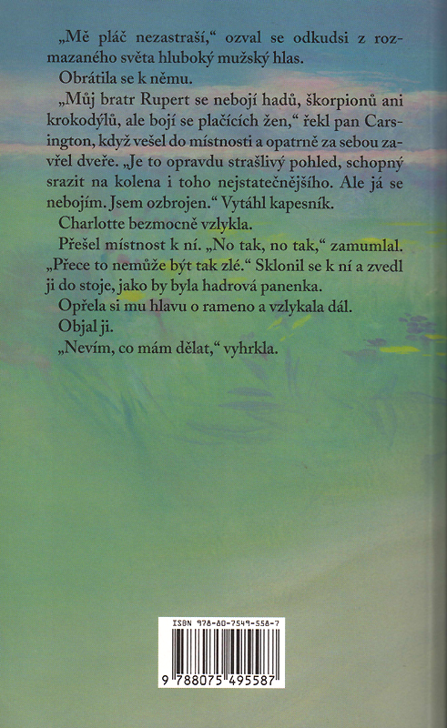 „Mě pláč nezastraší," ozval se odkudsi z rozmazaného světa hluboký mužský hlas. Obrátila se k němu. „Můj bratr Rupert se nebojí hadů, škorpionů ani krokodýlů, ale bojí se plačících žen," řekl pan Carsington, když vešel do místnosti a opatrně za sebou zavřel dveře. „Je to opravdu strašlivý pohled, schopný srazit na kolena i toho nejstatečnějšího. Ale já se nebojím. Jsem ozbrojen." Vytáhl kapesník. Charlotte bezmocně vzlykla. Přešel místnost k ní. „No tak, no tak," zamumlal. „Přece to nemůže být tak zlé." Sklonil se k ní a zvedl ji do stoje, jako by byla hadrová panenka. Opřela si mu hlavu o rameno a vzlykala dál. Objal ji. „Nevím, co mám dělat," vyhrkla.