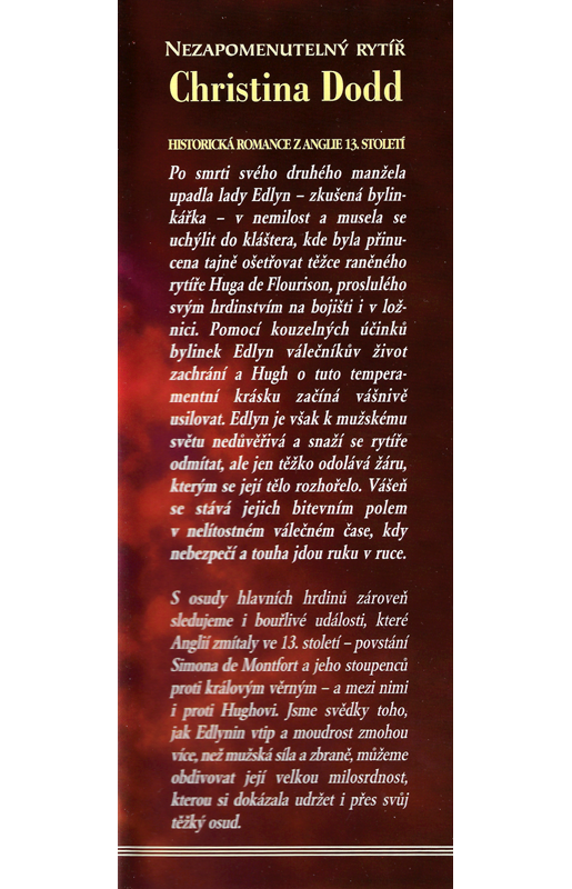 Po smrti svého druhého manžela upadla lady Edlyn - zkušená bylinkářka - v nemilost a musela se uchýlit do kláštera, kde byla přinucena tajně ošetřovat těžce raněného rytíře Huga de Flourison, proslulého svým hrdinstvím na bojišti i v ložnici. Pomocí kouzelných účinků bylinek Edlyn válečníkův život zachrání a Hugh o tuto temperamentní krásku začíná vášnivě usilovat. Edlyn je však k mužskému světu nedůvěřivá a snaží se rytíře odmítat, ale jen těžko odolává žáru, kterým se její tělo rozhořelo. Vášeň se stává jejich bitevním polem v nelítostném válečném čase, kdy nebezpečí a touha jdou ruku v ruce.