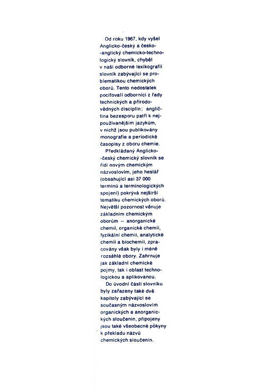 Předkládaný Anglicko-český chemický slovník se řídí novým chemickým názvoslovím, jeho heslář (obsahující asi 37 000 termínů a terminologických spojeni) pokrývá nejširší tematiku chemických oborů. Největší pozornost věnuje základním chemickým oborům - anorganické chemii, organické chemii, fyzikální chemii, analytické chemii a biochemii...