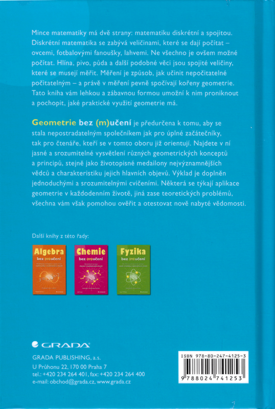 Geometrie bez (m)učení je předurčena k tomu, aby se stala nepostradatelným společníkem jak pro úplné začátečníky, tak pro čtenáře, kteří se v tomto oboru již orientují. Najdete v ní jasné a srozumitelné vysvětlení různých geometrických konceptů a principů, stejně jako životopisné medailony nejvýznamnějších vědců a charakteristiku jejich hlavních objevů. Výklad je doplněn jednoduchými a srozumitelnými cvičeními. Některá se týkají aplikace geometrie v každodenním životě, jiná zase teoretických problémů, všechna vám však pomohou ověřit a otestovat nově nabyté vědomosti.