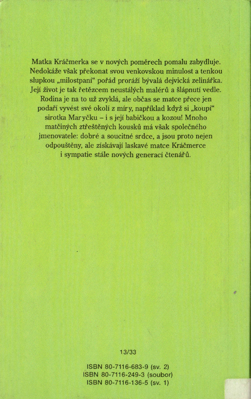 | Poznámka | Kniha vyřazena z knihovního fondu (obsahuje evidenční čísla, polepy, stopy po polepech a razítka knihovny) |