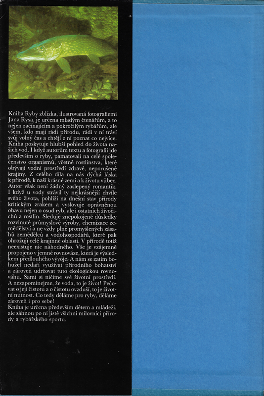 Kniha Ryby zblízka, ilustrovaná fotografiemi Jana Rysa, je určena mladým čtenářům, a to nejen začínajícím a pokročilým rybářům, ale všem, kdo mají rádi přírodu, rádi v ní tráví svůj volný čas a chtějí z ní poznat co nejvíce. Kniha poskytuje hlubší pohled do života našich vod. I když autorům textu a fotografií jde především o ryby, pamatovali na celé společenstvo organismů, včetně rostlinstva, které obývají vodní prostředí zdravé, neporušené krajiny. Z celého díla na nás dýchá láska k přírodě, k naší krásné zemi a k životu vůbec. Autor však není žádný zaslepený romantik. I když u vody strávil ty nejkrásnější chvíle svého života, pohlíží na dnešní stav přírody kritickým zrakem a vyslovuje oprávněnou obavu nejen o osud ryb, ale i ostatních živočichů a rostlin. Sleduje znepokojeně důsledky rozvinuté průmyslové výroby, chemizace zemědělství a ne vždy plně promyšlených zásahů zemědělců a vodohospodářů, které pak ohrožují celé krajinné oblasti. V přírodě totiž neexistuje nic náhodného. Vše je vzájemně propojeno v jemné rovnováze, která je výsledkem předlouhého vývoje. A nám se zatím bohužel nedaří využívat přírodního bohatství a zároveň udržovat tuto ekologickou rovnováhu. Sami si ničíme své životní prostředí. A nezapomínejme, že voda, to je život! Pečovat o její čistotu a o čistotu ovzduší, to je životní nutnost. Co tedy děláme pro ryby, děláme zároveň i pro sebe!