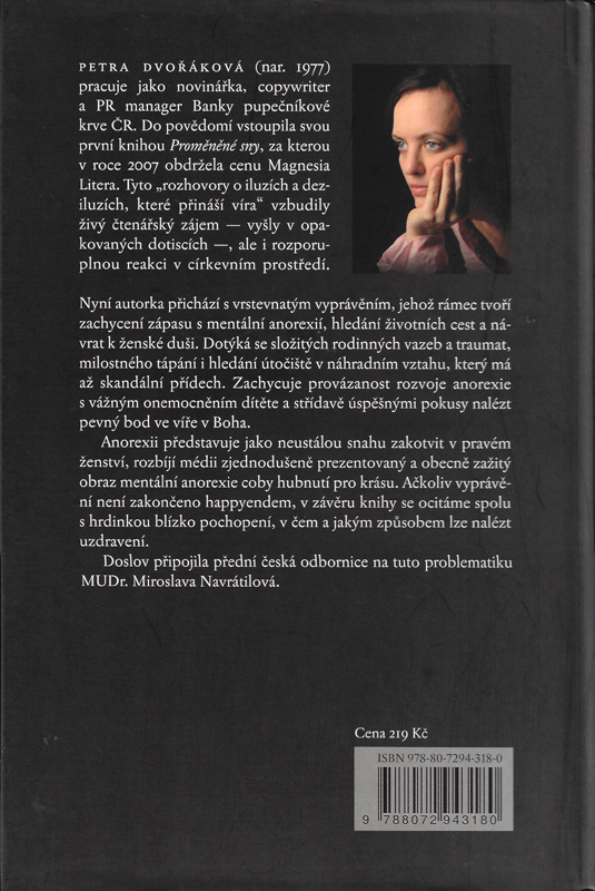 Nyní autorka přichází s vrstevnatým vyprávěním, jehož rámec tvoří zachycení zápasu s mentální anorexií, hledání životních cest a návrat k ženské duši. Dotýká se složitých rodinných vazeb a traumat, milostného tápání i hledání útočiště v náhradním vztahu, který má až skandální přídech. Zachycuje provázanost rozvoje anorexie s vážným onemocněním dítěte a střídavě úspěšnými pokusy nalézt pevný bod ve víře v Boha.