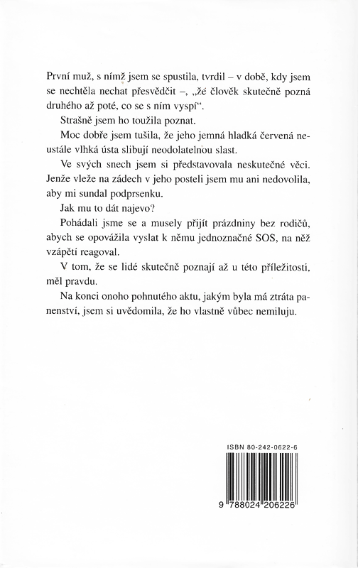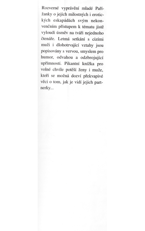 Rozverné vyprávění mladé Pařížanky o jejích milostných i erotických eskapádách svým nekonvenčním přístupem k tématu jistě vyloudí úsměv na tváři nejednoho čtenáře. Letmá setkání s cizími muži i dlouhotrvající vztahy jsou popisovány s vervou, smyslem pro humor, odvahou a odzbrojující upřímností. Pikantní knížka pro volné chvíle potěší ženy i muže, kteří se možná dozví překvapivé věci o tom, jak je vidí jejich partnerky...