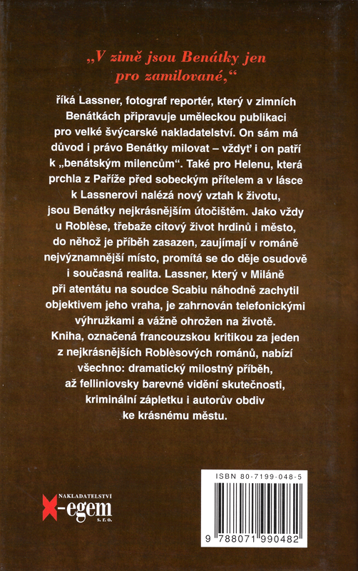 „V zimě jsou Benátky jen pro zamilované,“ říká Lassner, fotograf reportér, který v zimních Benátkách připravuje uměleckou publikaci pro velké švýcarské nakladatelství. On sám má důvod i právo Benátky milovat - vždyť i on patří k „benátským milencům". Také pro Helenu, která prchla z Paříže před sobeckým přítelem a v lásce k Lassnerovi nalézá nový vztah k životu, jsou Benátky nejkrásnějším útočištěm. Jako vždy u Roblése, třebaže citový život hrdinů i město, do něhož je příběh zasazen, zaujímají v románě nejvýznamnější místo, promítá se do děje osudově i současná realita. Lassner, který v Miláně při atentátu na soudce Scabiu náhodně zachytil objektivem jeho vraha, je zahrnován telefonickými výhružkami a vážně ohrožen na životě. Kniha, označená francouzskou kritikou za jeden z nejkrásnějších Roblésových románů, nabízí všechno: dramatický milostný příběh, až felliniovsky barevné vidění skutečnosti, kriminální zápletku i autorův obdiv ke krásnému městu.