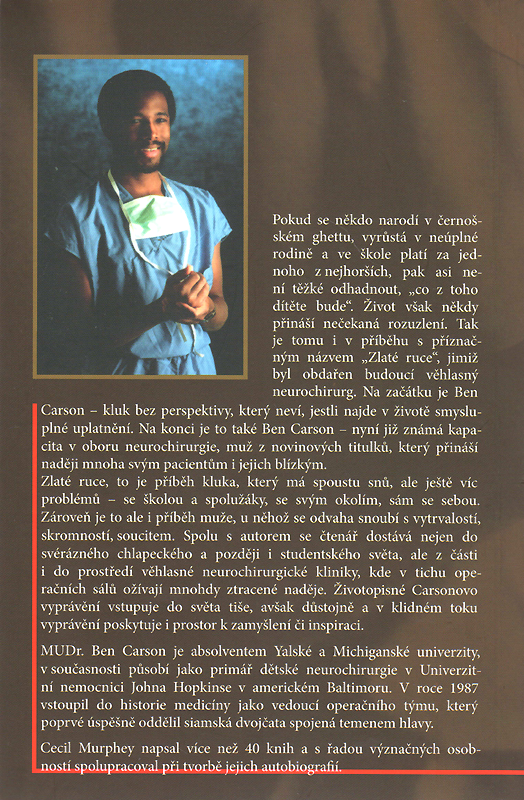 Pokud se někdo narodí v černošském ghettu, vyrůstá v neúplné rodině a ve škole platí za jednoho z nejhorších, pak asi není těžké odhadnout, „co z toho dítěte bude". Život však někdy přináší nečekaná rozuzlení. Tak je tomu i v příběhu s příznačným názvem „Zlaté ruce", jimiž byl obdařen budoucí věhlasný neurochirurg. Na začátku je Ben Carson - kluk bez perspektivy, který neví, jestli najde v životě smysluplné uplatnění. Na konci je to také Ben Carson - nyní již známá kapacita v oboru neurochirurgie, muž z novinových titulků, který přináší naději mnoha svým pacientům i jejich blízkým.