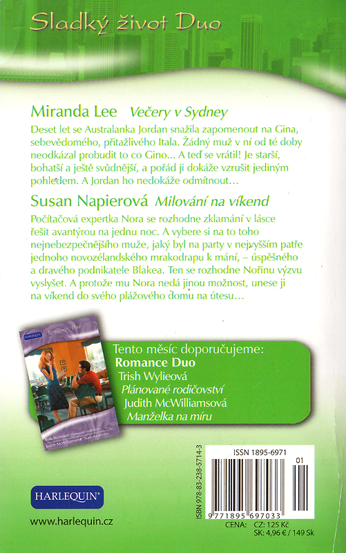 Harlequin Edice: Sladký život Duo č. 34 I 01/09 | Večery v Sydney: Deset let se Australanka Jordan snažila zapomenout na Itala Gina. Ten se teď vrátil! Je starší, bohatší a ještě svůdnější. A Jordan ho nedokáže odmítnout... | Milování na víkend: Počítačová expertka Nora řeší nešťastnou lásku avantýrou na jednu noc s dravým podnikatelem Blakem. Ten ji na víkend unese do plážového domu na útesu...