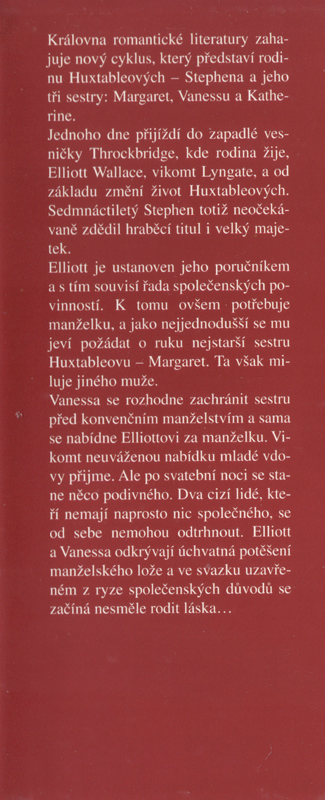 Královna romantické literatury zahajuje nový cyklus, který představí rodinu Huxtableových - Stephena a jeho tři sestry: Margaret, Vanessu a Katherine. Jednoho dne přijíždí do zapadlé vesničky Throckbridge, kde rodina žije, Elliott Wallace, vikomt Lyngate, a od základu změní život Huxtableových. Sedmnáctiletý Stephen totiž neočekávaně zdědil hraběcí titul i velký majetek...
